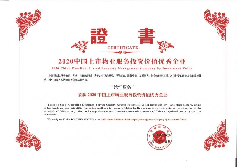 BINJIANG SERVICE is the 2020 China Excellent Listed Property Management Company by Investment Value.