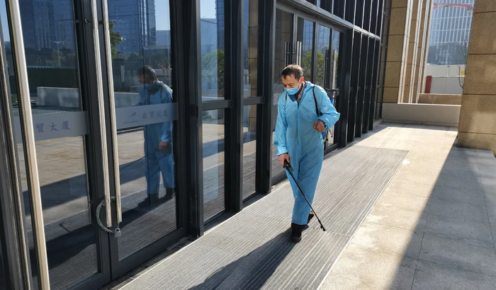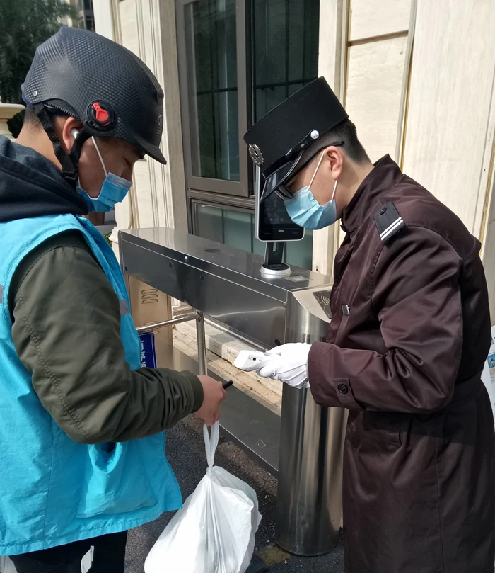 To fully and practically implement epidemic control is a top priority of the work of all projects of Binjiang Property, especially building projects. How is the epidemic control work going now? Property management staff keep strict control of the gate and require office workers to wear masks and show the unified QR codes issued by the government. Only those with a green code and normal body temperature measured by the machine or property management staff are allowed to enter buildings. Elevator cars are disinfected four times a day, and disinfection of other public areas is also implemented strictly following the requirements. And face-to-face delivery of takeouts is also prohibited to avoid contact. All necessary epidemic control measures are taken strictly with no slackness.