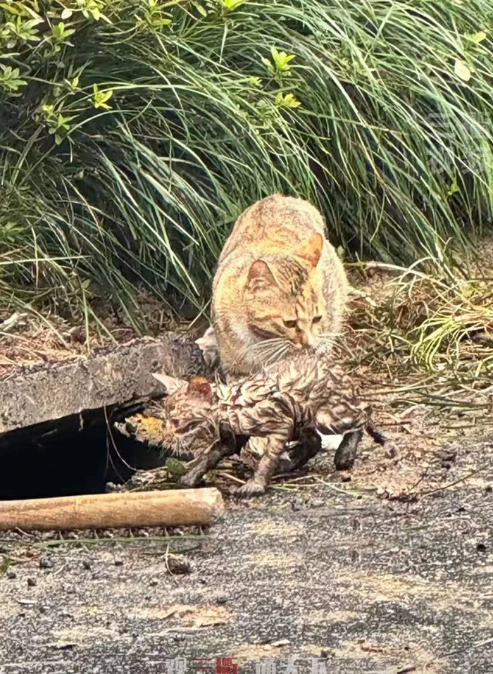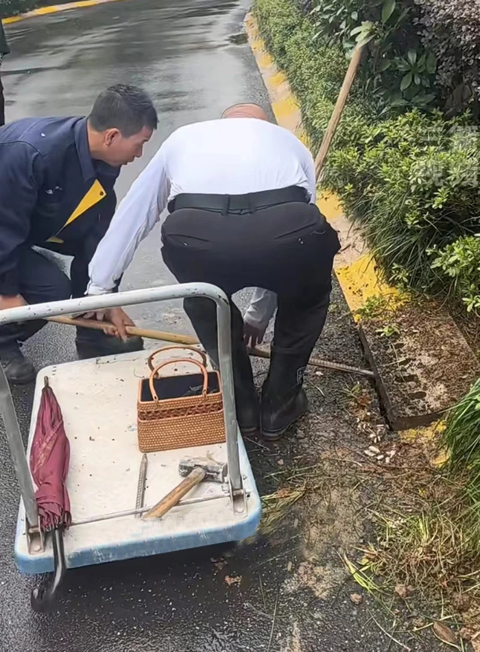 The engineer, order team member, and customer service staff arrived soon with tools. Together, they knocked and chiseled, finally prying open the drain cover. The kitten, afraid of so many people around, cowered in the sewer and dared not to show its head. So, the property staff used a hammer to prop up the cover to leave space for the kitten and then stepped aside, leaving only the mother cat to call the kitten. Sure enough, the kitten emerged immediately after hearing its mother and got out and cuddled up to its mother. It was such a heartwarming reunion scene.
