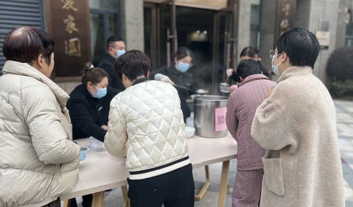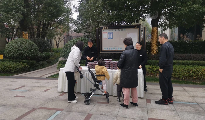 In Thousand Island Lake East Coast, another 500 bowls of Laba porridge cooked by the night-shift property management staff in the early hours of the morning was distributed. The customer service team began to distributed the porridge to proprietors going to work at various gates at around 7:20, and other proprietors were allowed to received a bowl of porridge at the service center after 8:00. As to elderly proprietors living alone, property management staff offered extra care and sent the porridge to them in person.