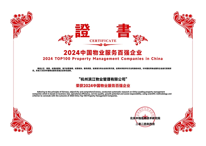 Hangzhou Binjiang Property Management Company (“hereinafter referred to as “Binjiang Property”) has been honored as the “2024 Top 100 Property Management Company in China” and “2024 Leading Enterprise in High-end Property Service” for its extraordinary business wisdom, remarkable market performance, and excellent service quality.
