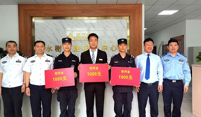 On May 7th, accompanied by personnel from the Fuyang Foundation for Justice and Courage and the local police station, Deputy Director Shao Zhiyong of the Hangzhou Public Security Bureau Fuyang Sub-bureau came to the Shui Xie Shan Ju service center to visit Lu Weiming, Liu Jinbiao, and Han Xinjun, extending their gratitude with a reward money.