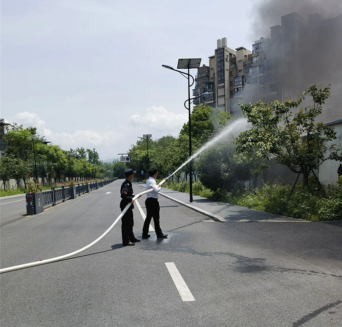 As there’s no fire hydrant in the Beizhijiang Renovation Project Office, the emergency team connected a fire hose from a fire hydrant in the residential quarter all the way to the Project Office, and the water successfully came out at 12:12. At the same time, the firefighters arrived. Under the direction of firefighters, the Binjiang Property staff offered active assistance and extinguished the raging fire in the vehicle.