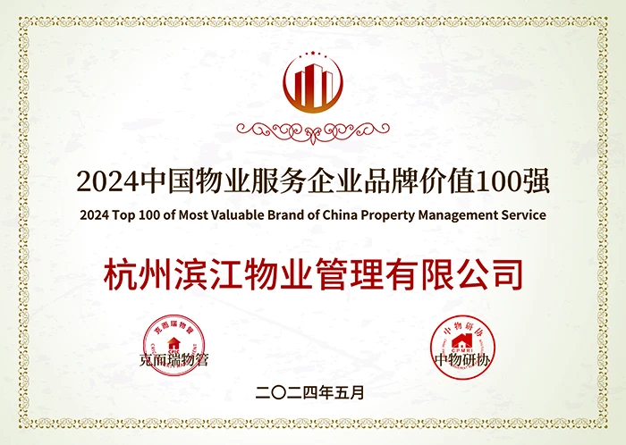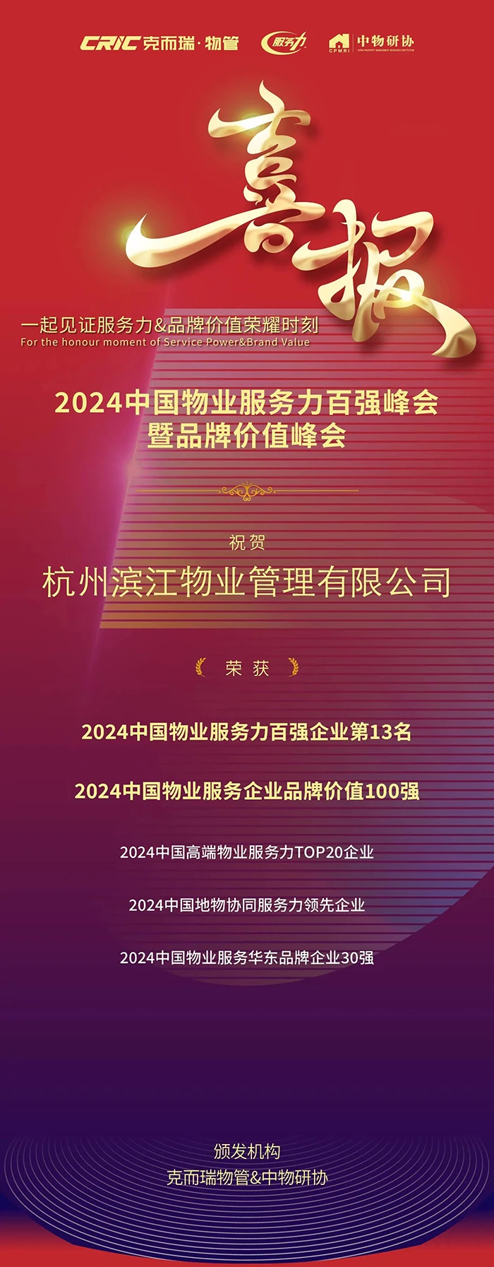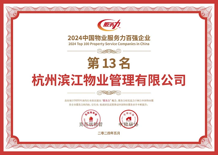 Witness the Glorious Moment of “Service Force and Brand Value”: Binjiang Property Won the 13th Place Among “2024 Top 100 Chinese Property Service Providers” and Other Awards