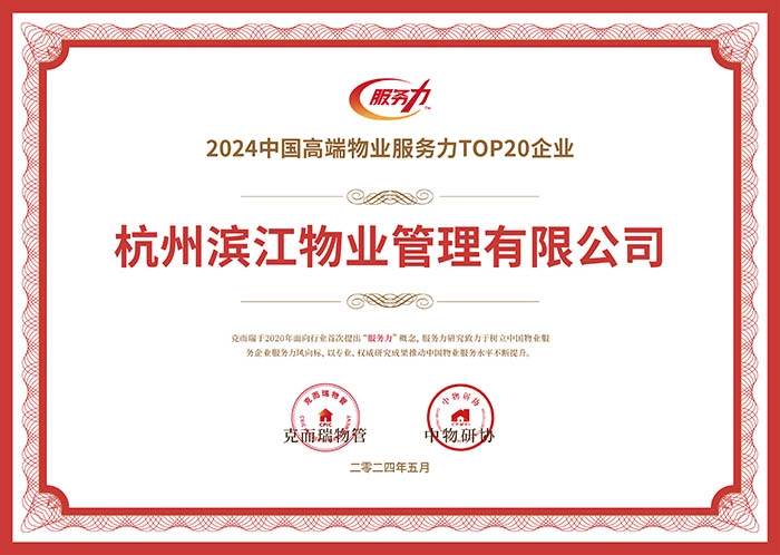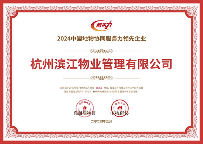 Binjiang Property was honored with several prestigious awards at this summit, including “2024 Top 100 Chinese Property Service Providers”, “2024 Top 100 Chinese Property Service Providers in Brand Value”, “2024 Top 20 Chinese High-End Property Service Providers”, and “2024 China Leading Enterprise in Real Estate-Property Collaborative Service Force”.
