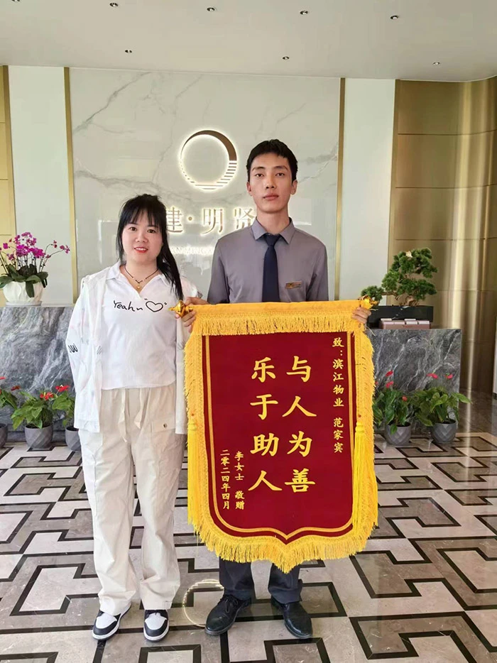 Fan Jiabin asked if Ms. Li wanted him to send her to the hospital and was told that her family was nearby. After contacting Ms. Li’s family, she was taken to the hospital, where she was diagnosed with a severe fracture due to the fall. After recuperating for a month and being able to walk normally, Ms. Li immediately sent a silk banner to the sales office to express her gratitude to Fan Jiabin for being “Kind and Helpful”.