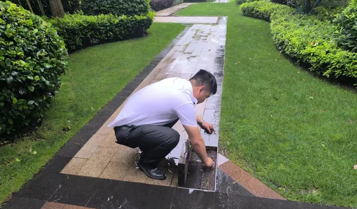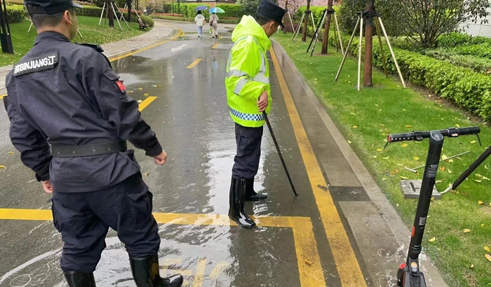 In Hangzhou Double Bay International City, the property management staff did a comprehensive inspection of the residential quarter’s drainage system during the rainstorm, including the cleaning of road drainage ditches, inspection and unclogging of roof gutters and floor drains, and testing of flood control baffles, ensuring all preventive measures were in place to secure the security of the residential quarter.