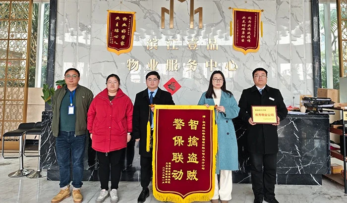 On January 21st, 2025, a silk banner inscribed with “Synergy of the Police and Security Guards, Dead End of Thieves” and a medal of 2024 Outstanding Property Management Enterprise were sent to the property management service center of Yiwu The Top Grade by Yiwu Futian Police Station and Futian Shangcheng Community in recognition of the property management service center’s extraordinary contribution to the security of the community.