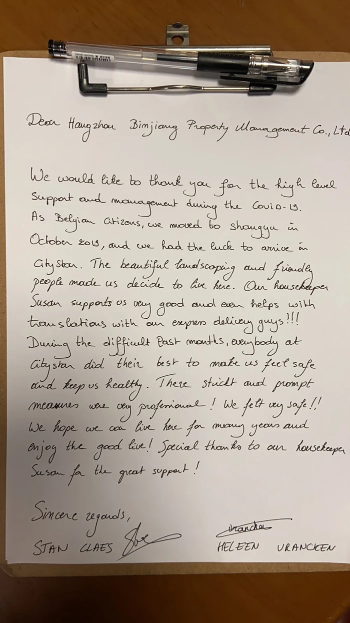 We would like to thank you for the high level support and management during the Covid-19. As Belgian citizens, we moved to Shangyu in October 2019, and we had the luck to arrive in City Star. The beautiful landscaping and friendly people made us decide to live here. Our housekeeper Susan supports us very good and even helps with translations with our express delivery guys!!! During the difficult past months, everybody at City Star did their best to make us feel safe and keep us healthy. These strict and prompt measures were very professional! We felt very safe!! We hope we can live here for many years and enjoy the good live! Special thanks to our housekeeper Susan for the great support!