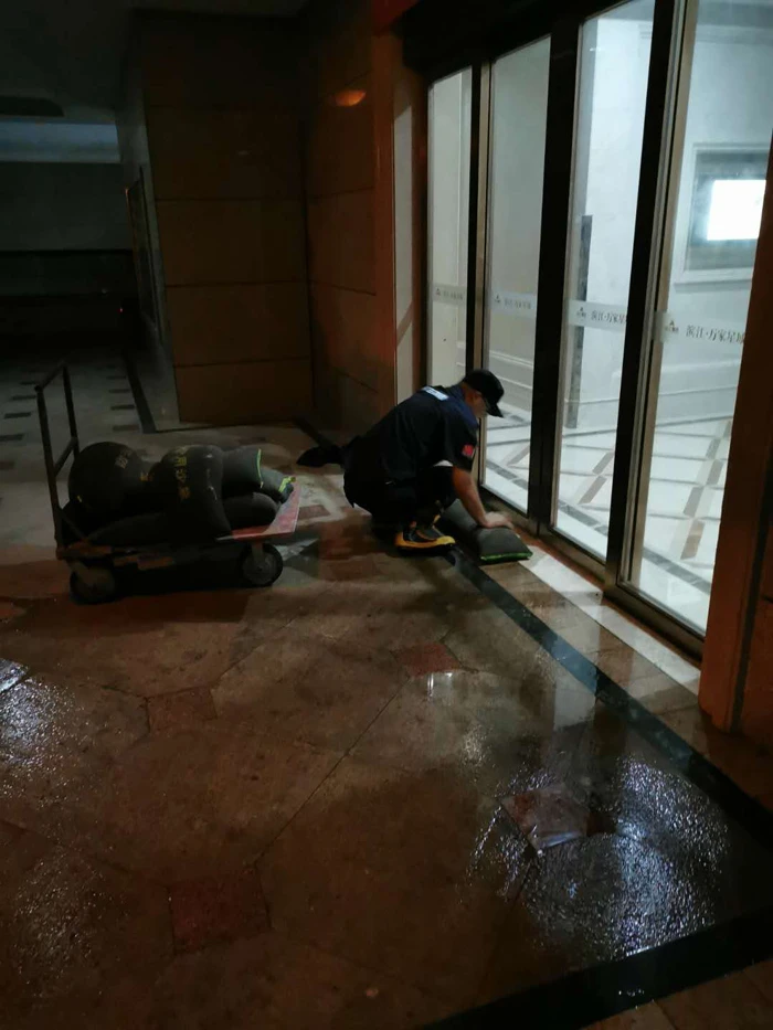 To handle the orange rainstorm warning, the property management team of Myriad Star made preparatory work for possible heavy rainfall, enhanced regional checking, and arranged night patrol. The torrential rain came as expected. As the roads and open floors in the residential quarter began to become waterlogged, the property management team launched the emergency plan instantly. At Myriad Star Phase III, sandbags were soon arranged as the final barrier at the entrance of building halls that are likely to be flooded, and the rainspouts were cleaned. Before the rainstorm, property management staff stood out bravely to safeguard the Myriad Star and protect the safety of proprietors.