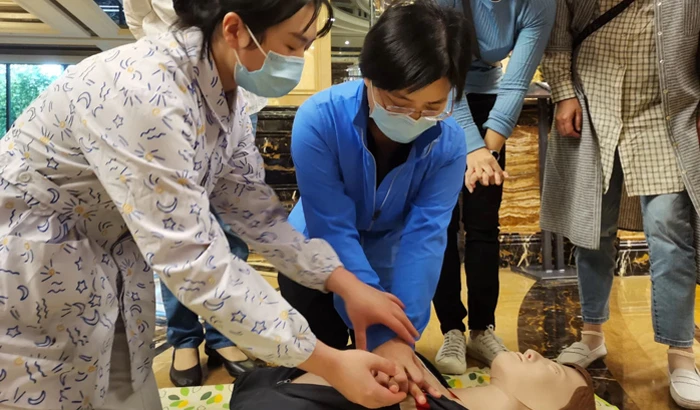 CPR perfectly explains why “time is life”. The first aid training started from the theoretic knowledge explanation by director Wang Jianyang of vascular surgery of the hospital. Director Wang emphatically explained identification, pressing techniques, artificial breathing, and defibrillation of CPR.