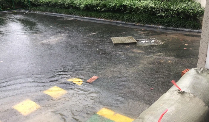 A sudden danger appeared in Long Shan Guan Di at 7:55 on July 26th. At the ramp entrance of the basement of Building 38, beside the curbstone of the green area, flowed a stream of water. The project director checked the situation immediately and ordered engineering staff and order team members to strengthen drainage.