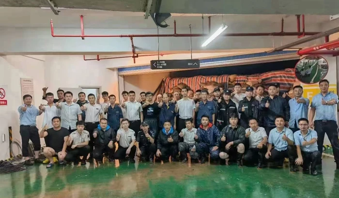 At about 8:40, the water of the peripheral river suddenly made a breach and flowed to the ramp of the basement of Building 38. The service center urgently noticed proprietors to move valuables at the basement upstairs and, at the same time, reported the emergency to the proprietors’ committee, the real estate company, the subdistrict community, and the regional branch of Binjiang Property, all of whom sent assistance to Long Shan Guan Di actively.