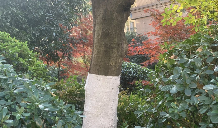 With the guidance of the landscape architect of Binjiang Property, greening workers of various residential quarters painted trees of poor cold resistance white with lime sulfur to prevent these trees from frost as well as insects. The neat white line is exactly the same as what we can see now on trees such as Chinese parasol trees by the West Lake and is a typical scene of winter.