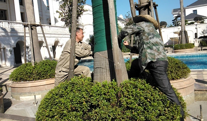 Tropical plants such as palm trees, Phoenix canariensis and Washingtonia filifera are a feature of Binjiang Property mansions. These days, diligent greening workers put cold-proof non-woven coats on tropical plants 2.5-3 meters above the roots according to the given standard to help these trees weather the cold winter. The landscape architect Master Guo also suggests that these trees should wear another plastic film when the temperature is below zero.