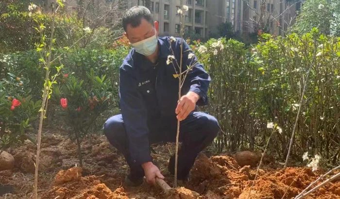 Scraping a hole, putting in the plant, filling and watering are a routine process of tree planting. In Quzhou Chunjiangyue, property management staff planted more than 60 trees on the Arbor Day, including peach trees, cherry trees, kumquat trees, and Camellia azalea trees. The cherry trees and Camellia azalea trees were still in bloom and had white and red flowers on them and there were still fruit hanging on the kumquat trees when they were planted. What the property management staff planted were not only trees but also hope for the future.