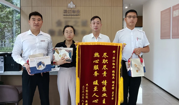 On the morning of September 1st, proprietor Xu visited the service center of Hangzhou Fuyang Golden City as soon as it opened with a silk banner and six boxes of mooncakes for three property management workers of Binjiang Property. Where did such gratitude come from?