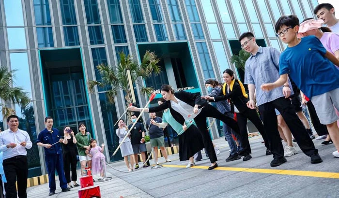 5 teams consisting of employees from various enterprises in the building were assembled to participate in entertaining sports such as tug of war, jumping long rope, and pitching pots, demonstrating high-spirited and positive sportsmanship. The organizers also read the Asian Games initiative “Heart to Heart, @ You in the City" on the spot, encouraging everyone to actively participate in the great event.