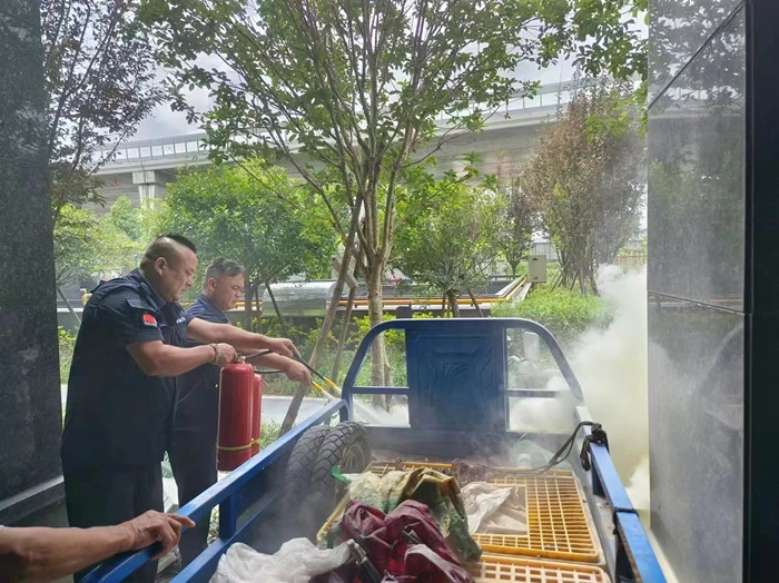 7月27日,滨江物业所属滨弘物业服务的杭州和平桥名苑的巡逻岗吕孟辉在园区巡查时,发现业主的三轮电动车在冒烟。他立即呼叫领班并汇报情况,服务中心立即安排就近的队员赶往现场与巡逻岗队员一起用灭火器灭火,工程主管也带领工程员提着灭火器赶到现场协助,在大家共同的努力下扑灭初期火情。