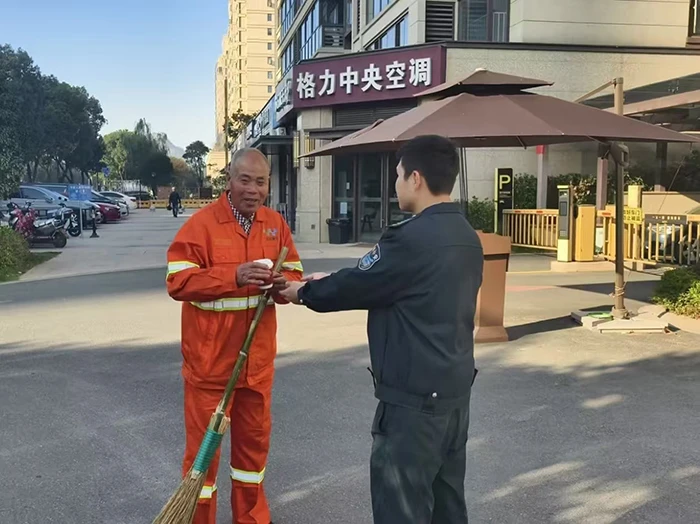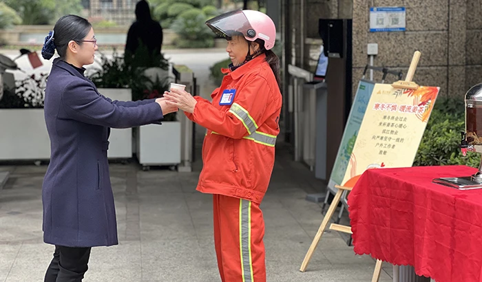 初冬清晨,温岭万家之星小区南门口设置了姜枣茶派发点,物业人员将自己熬煮的一杯杯热乎乎、驱寒的姜枣茶送到了业主、环卫工人手中。物业人递出姜枣茶时不断关照业主、小哥们路上要注意安全,向环卫工人表达“您辛苦了”,这些都映照出一线滨江物业人服务的温度和对服务理念的坚守。