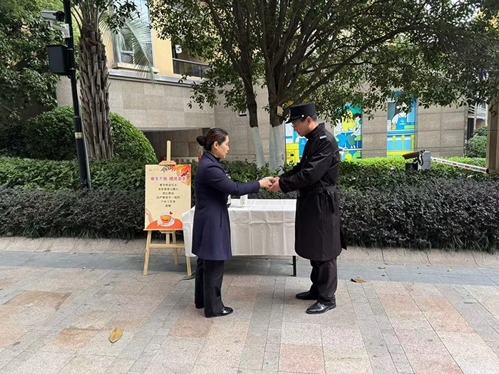 小区内弥漫着茶香四溢,一场冬日送姜枣茶活动温情开启,服务人员将一杯杯姜枣茶送到过往业主手中,并送上冬日问候,业主们手捧姜枣茶,脸上洋溢着感动与欣喜。一位业主阿姨笑着说:“这茶喝下去,全身都暖乎乎的,感觉小区就像一个温暖的大家庭。”