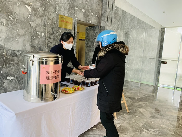 在杭州湘湖壹号小区,物业人员用一勺勺红糖、一片片生姜、一颗颗红枣熬出了热气腾腾的姜枣茶,供寒冬坚守在一线的外卖、快递小哥和一线物业人,以及园区业主取饮。物业人员表示,我们将红枣去核后剪成一片片与姜片、红糖一起熬煮。一大早,工作人员熬煮2个小时后,一大锅热气腾腾的姜枣茶放置在了会所门口桌台上,很快就把驱寒姜枣茶送到了大家的手中。