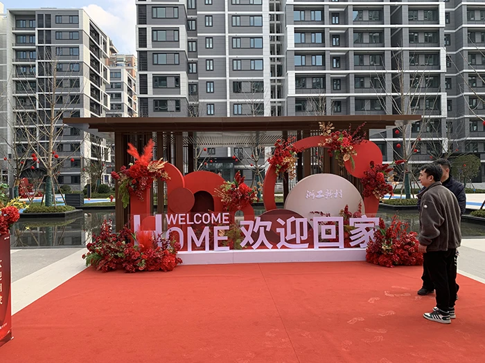 2月25日,浙工新村正式交付,入驻小区服务的是滨江物业,为了迎接这场特别的交付,物业人员用心布置,希望重新回家的业主踏上新家,爱上家,爱上小区。小区交付现场,沿街商铺红地毯一直延伸到小区内,典雅花束装置点缀现场,烘托交付的喜庆氛围。