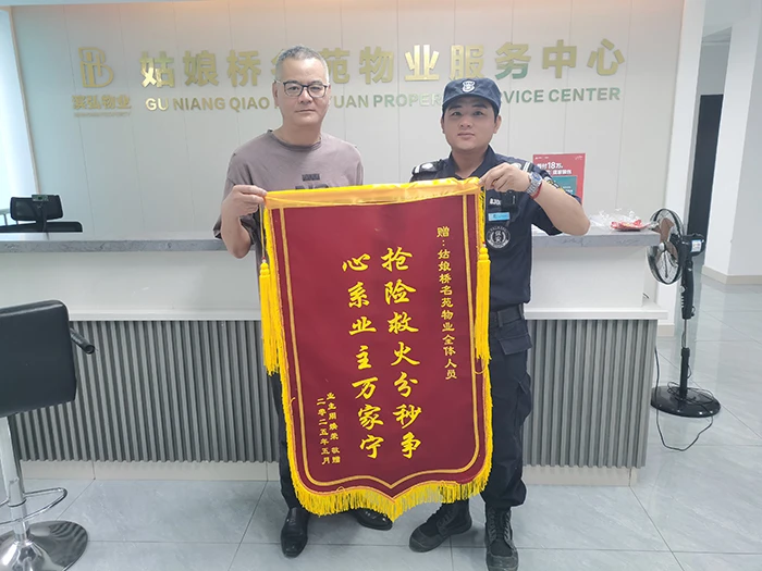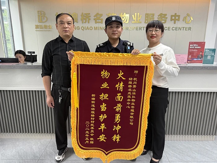 业主家人和姑娘桥村委会纷纷给小区物业人员送来锦旗。5月28日,姑娘桥村委治保周主任代表村委给物业送来锦旗时,表扬滨弘物业人员在火情面前勇冲锋,敢担当,保障了业主的生命安全和财产安全。