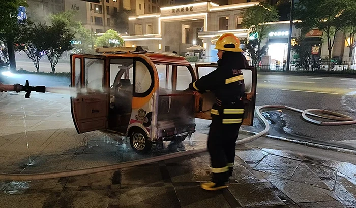 接到指令后,巡逻岗队员赵传许驾驶巡逻车疾驰而至,微型消防站队员携带专业设备火速赶到。此时,电动三轮车出现复燃迹象,众人分工明确,配合默契,微型消防站队员用水枪精准喷射核心着火点,门岗队员则持灭火器扑救。经过近十分钟的紧张处置,明火被彻底扑灭,队员们仔细检查确认无复燃风险后,才安心撤离。