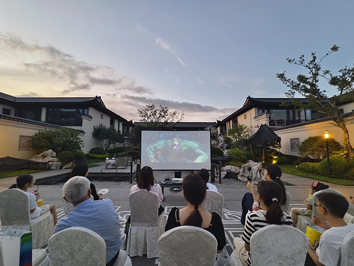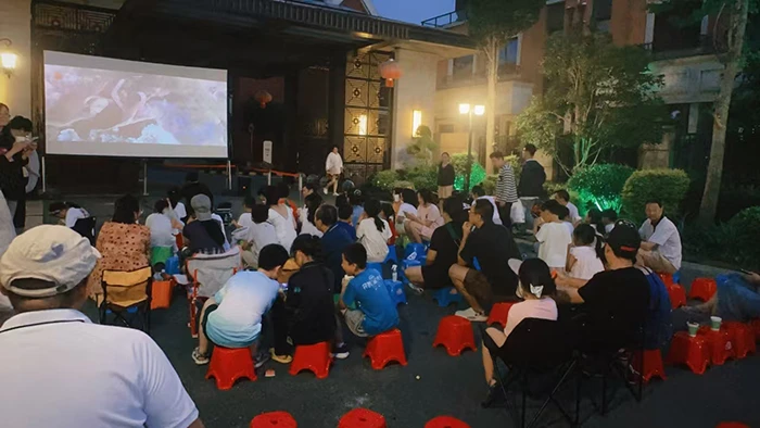 “在家门口看电影太好了,小朋友们也很开心,重温了小时候的幸福时光。”杭州湘湖壹号小区放映动画片《长安三万里》,受到了小朋友的喜爱。《西游记之大圣归来》,在杭州观湖里小区上映,吸引了百余位业主共赏,他们一路追寻大圣的冒险、救赎足迹。观影配以美食体验,满是烟火气。