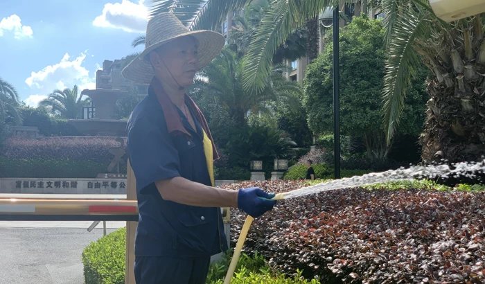 绿化师傅说:“这个地方是车辆出入口,绿化需要勤修剪,不然影响业主开车视线,气温这么高,浇水还得跟上。”