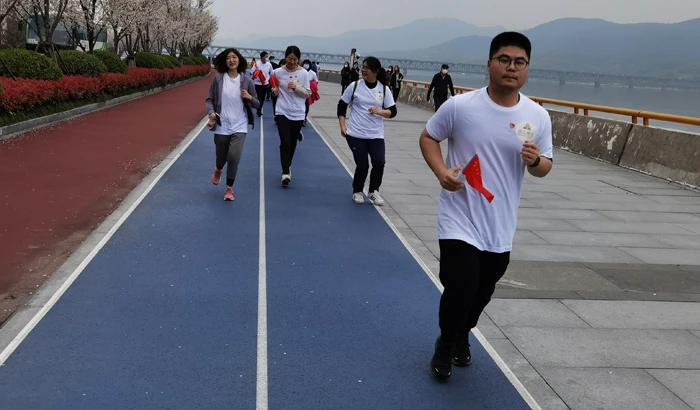 党员们从银杏汇小区东门出发抵达樱花跑道,3000余株樱花竞相开放,粉色樱花沿江堤绵延,一边樱花,一边江景,在江风与樱花相融的气息中跑步,跑出的是健康。