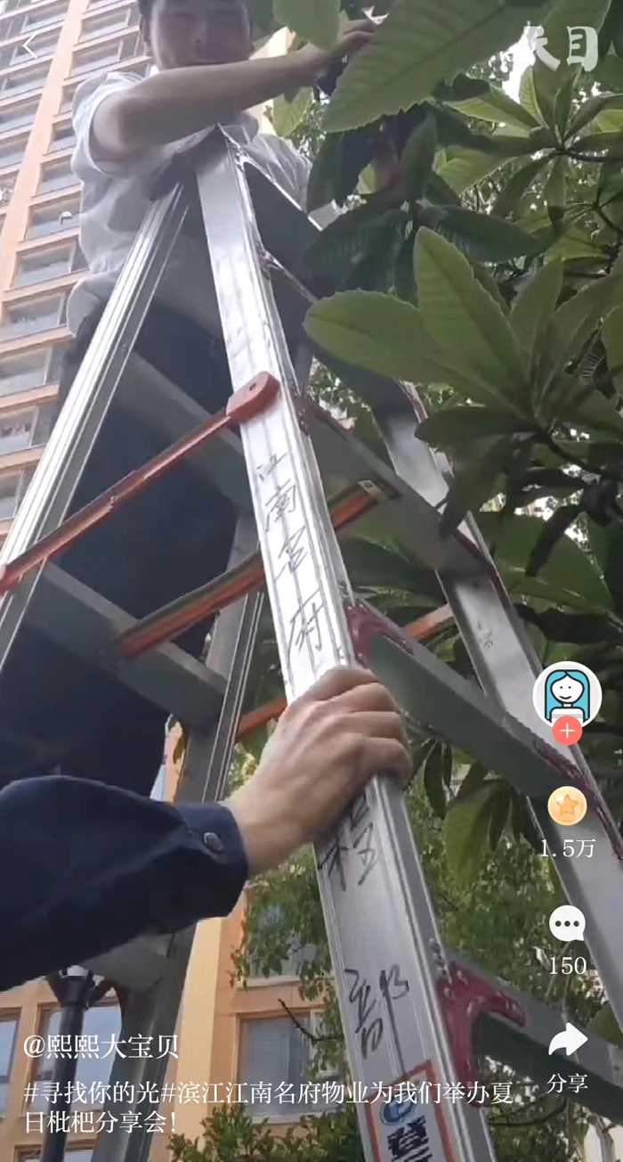 业主们的短视频,有记录今年春夏小区抗疫的众志成城,有秀出小区里天然的足球场,有把镜头对准小区建筑、园林美如画的风景线,有分享园区当季成熟的杨梅、枇杷,有传递社区活动的丰富多样,还追随物业人的脚步……他们都在寻找着那道光,是生活之光,是服务之光,更是希望之光。